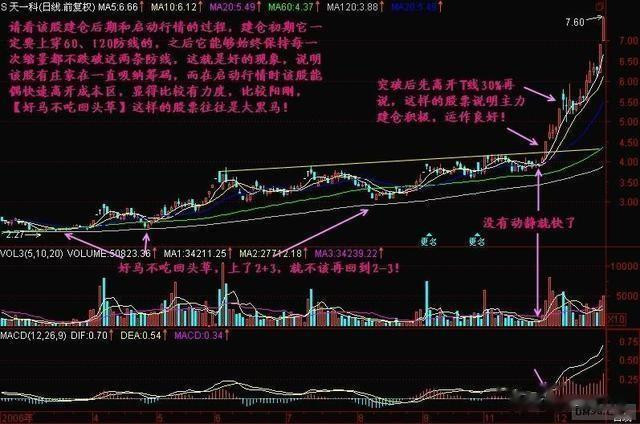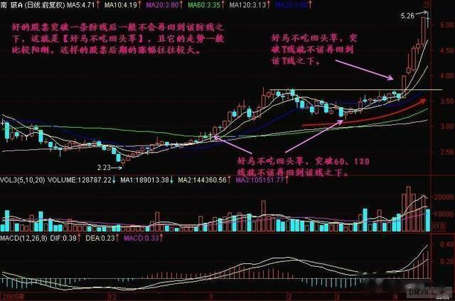 小结:一只好的股票,在大盘开始上涨之后,它应该表现为【好马不吃回头草】,只有这样的股票才说明庄家建仓积极,每突破一条防线之后,庄家就舍不得再让股价回到该防线之下了,如果能够回下来,就意味着庄家愿意让散户来逢低吸纳,这就从一个侧面说明几个问题,起码说明庄家决心不够强,或者说明庄家的资金实力有限,还可能是该股基本面有某种不确定性,使得庄家比较犹豫,还可能是多个主力在对弈,这样的股票就不可能是好股票!