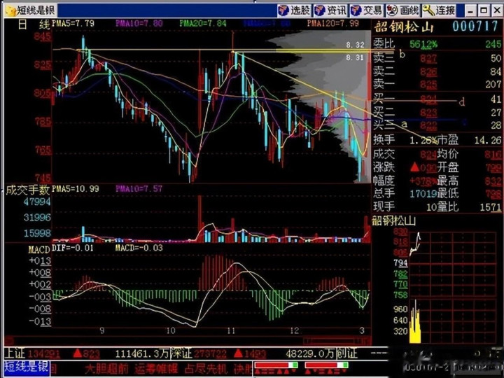 现在来看韶钢松山的分时图,巨量跳空,回档买进。现在还会不会有回档呢?还会有一点点的,昨天我们设了一道道防线来拴住这匹黑马,结果当天就给它打通两条。哪两条呢?一条是60日平均线7.88元,第二条是高点连线(下降趋势线),都是一举冲过,所以说在上升过程中,这个线那个线,统统都是棉纱线。有人说:“哎哟,这儿有个压力,那儿有个压力!”其实真涨的时候,没有压力的。下跌的时候道理也一样,有人说跌到这儿是个支撑线,跌到那儿是个支撑线,真正下跌了,不管你什么支撑线,统统都是棉纱线,没用的。